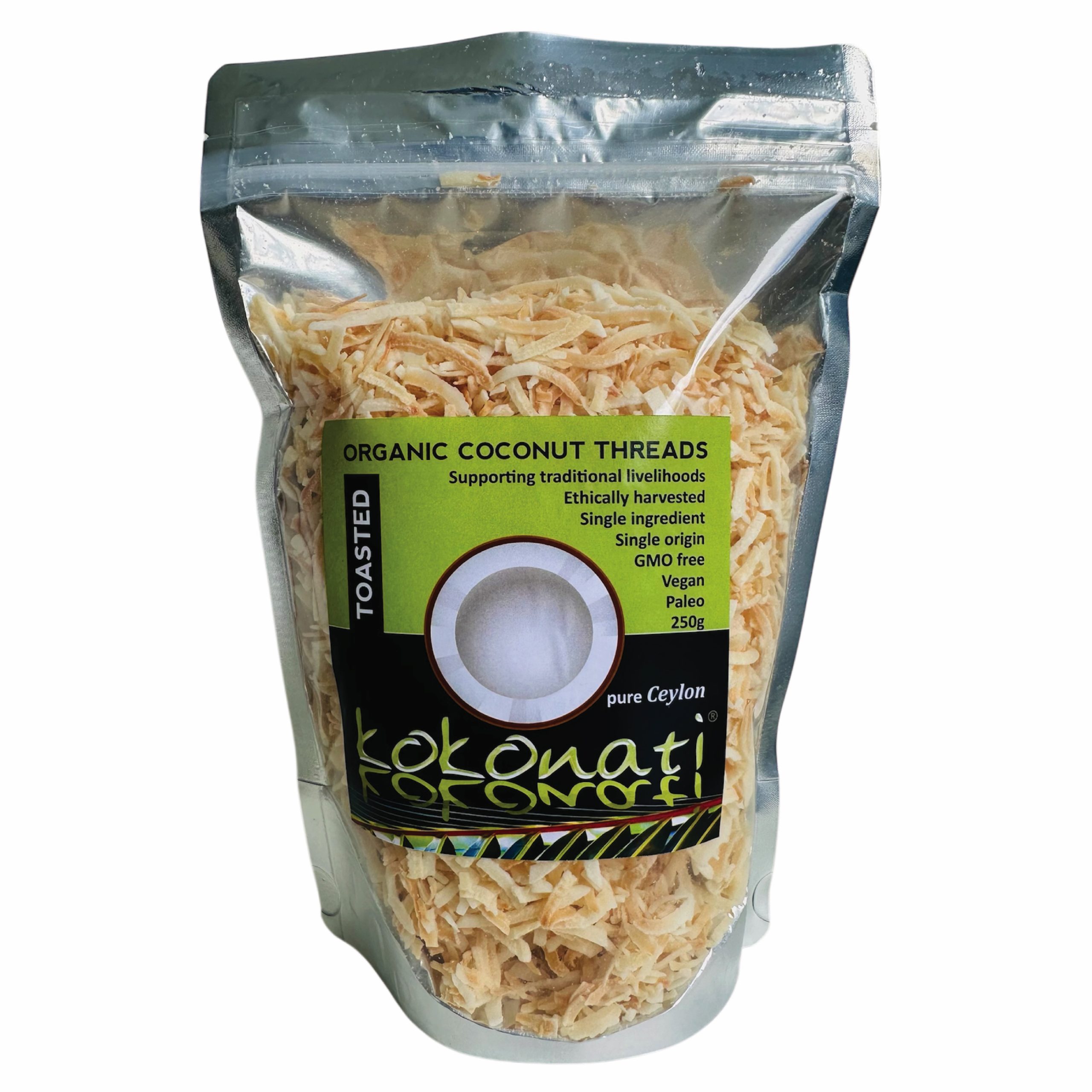 Flavor natural crunch of raw coconut meat and have a clean coconutty aroma! Kokonati coconut threads are more flavourful than standard desiccated coconut threads because the flavors have not been vented off by high temperatures and no moisture has been pressed out prior to drying.