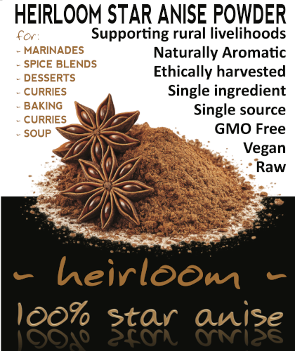 Star anise powder has a bold, aromatic profile that works well in baking, curries, broths, braises, spice blends, desserts, and warm drinks. Because it is already ground, it disperses easily into batters, sauces, rubs, and marinades without leaving behind pod fragments. It is especially useful when you want the flavour of star anise to carry through evenly, such as in Chinese five-spice blends, slow-cooked dishes, spiced syrups, mulled drinks, poached fruit, and rich baking recipes. Retail spice sellers commonly position ground star anise for braises, baked goods, Asian cooking, and warm beverages.